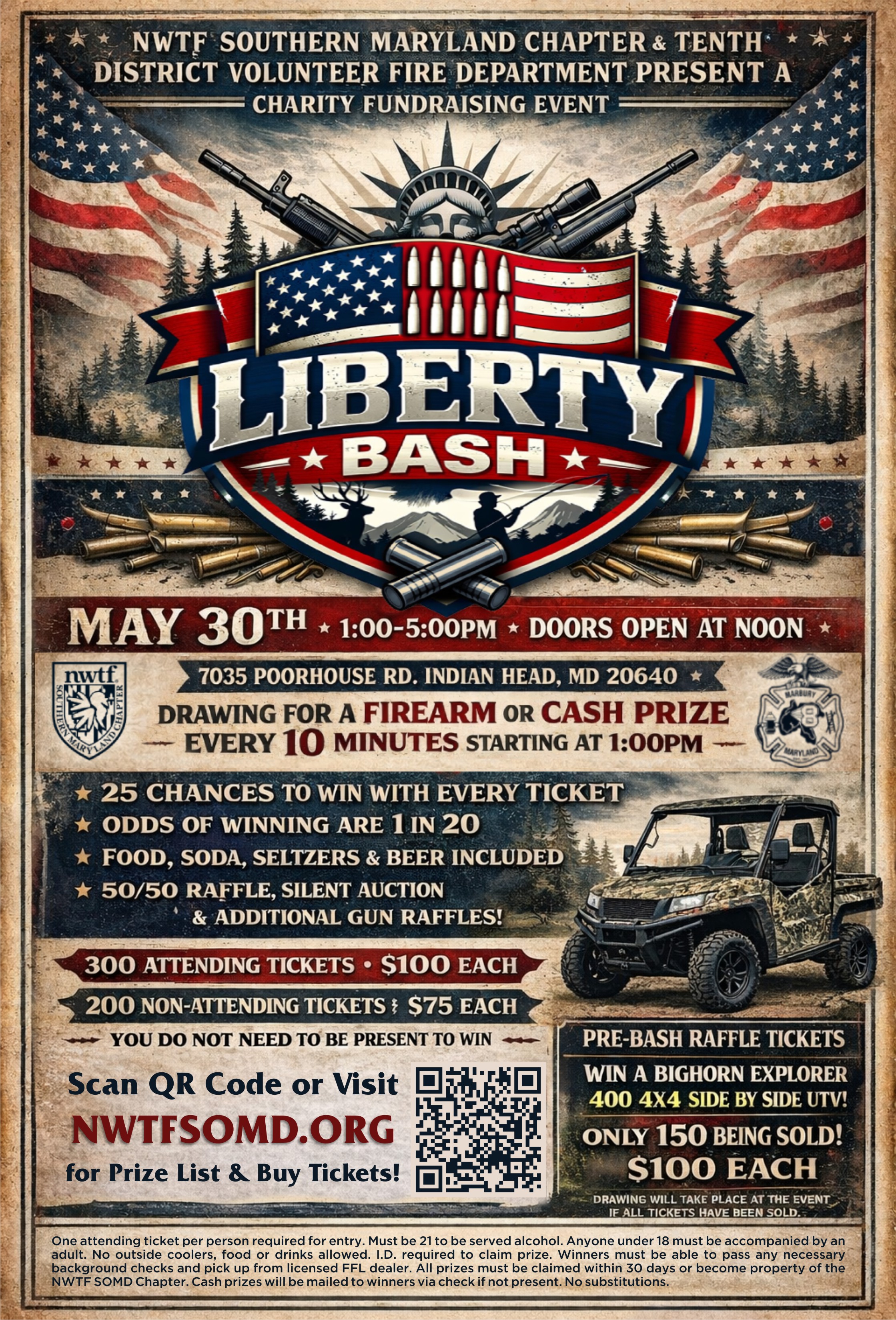 Liberty Bash Tickets: One attending ticket per person required for entry. Must be 21 to be served alcohol. Anyone under 18 must be accompanied by an adult. No outside coolers, food or drinks allowed. All ticket sales will be closed by 5:00 pm EST on May 29, 2026, unless sold out prior to that date. Winners will be drawn at random and announced by name of purchaser. Members who have purchased Attending Tickets will receive physical tickets at check-in upon arrival. Bring photo ID and proof of purchase for entry. Winners will be displayed live at the event and posted on this page the day after the event. Any winners with Non-Attending Tickets will be notified by phone and/or email. I.D. required to claim prize. Winners must be able to pass any necessary background checks and pick up from licensed FFL dealer. All prizes must be claimed within 30 days or become property of the NWTF SOMD Chapter. Cash prizes will be mailed to winners via check if not present. No substitutions. All tickets will be assigned a number internally from 001-500 for random drawing. Any unsold tickets will be assigned to the NWTF SOMD Chapter and entered into the drawing.